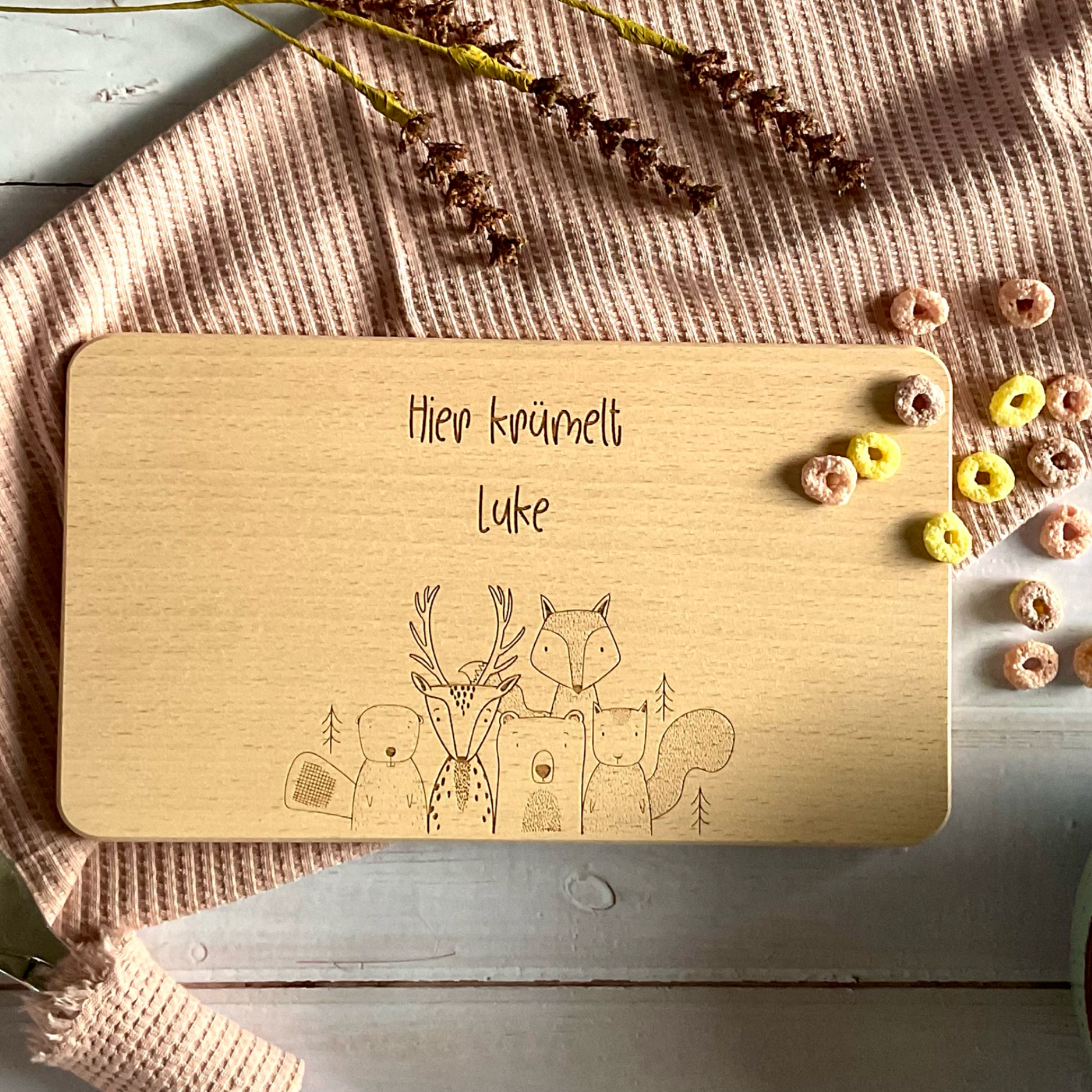 Frühstücksbrett Buchenholz "Hier krümelt mit Waldtieren..."