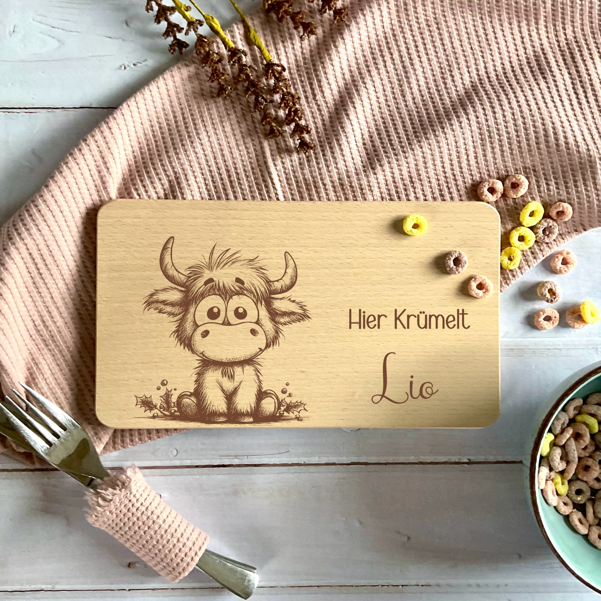 Frühstücksbrett Buchenholz "Hier krümelt… mit niedlicher Kuh"
