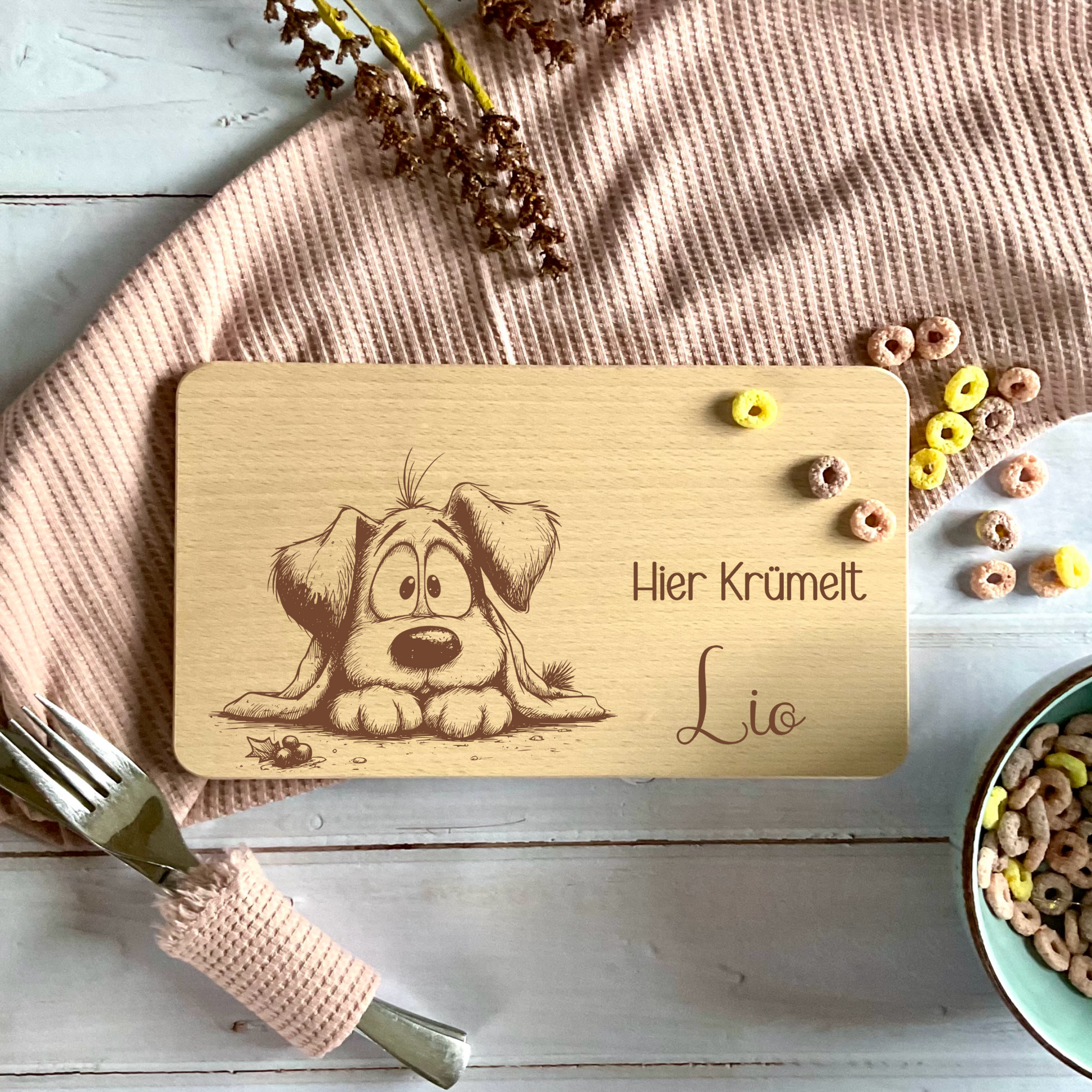 Frühstücksbrett Buchenholz "Hier krümelt mit…niedlichem Hund"